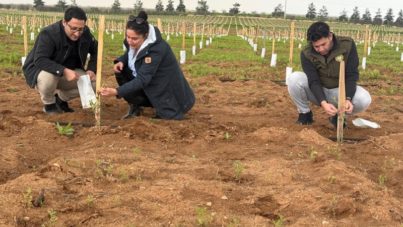 Projenin sağlıklı bir şekilde ilerlemesi ve fidanların gelişiminin takibi için periyodik bahçe kontrolleri büyük bir titizlikle yürütülmekte. Bu kapsamda, projenin kurumsal ortağı ve Ziraat Fakültesi Öğretim Üyesi Prof. Dr. Ebru Sakar ile TİGEM Ceylanpınar İşletmesi Müdür Yardımcıları Fatih Daş ve Volkan Yılmaz, kurulan plantasyon alanına ortak bir denetim ve inceleme ziyareti gerçekleştirdiler.